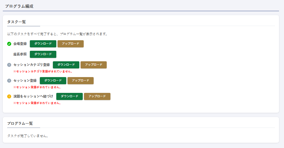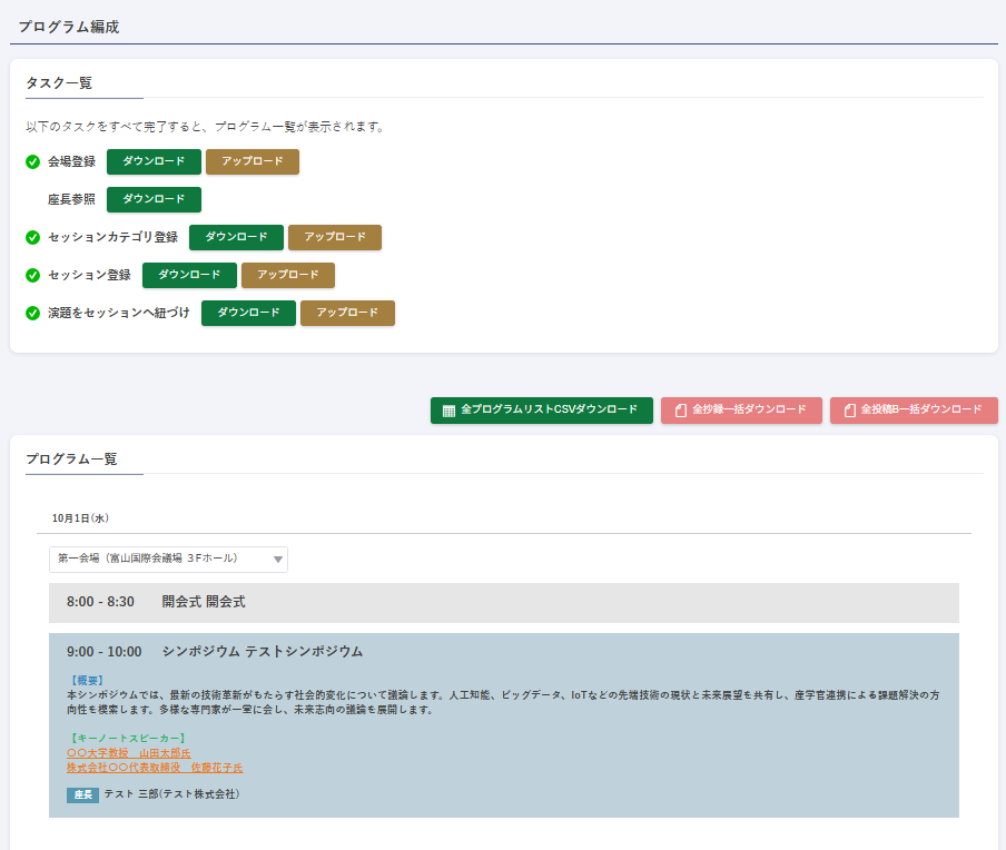 ここでは会場登録、セッションカテゴリ登録、セッション登録、演題のセッション割り当てを専用のCSVテンプレートを用いて行うことができます。