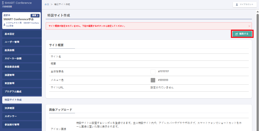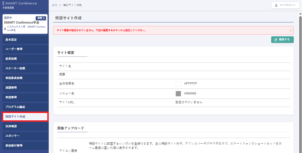 主催者管理画面左メニューの 「特設サイト作成」 をクリックすると、サイト概要が表示されます。