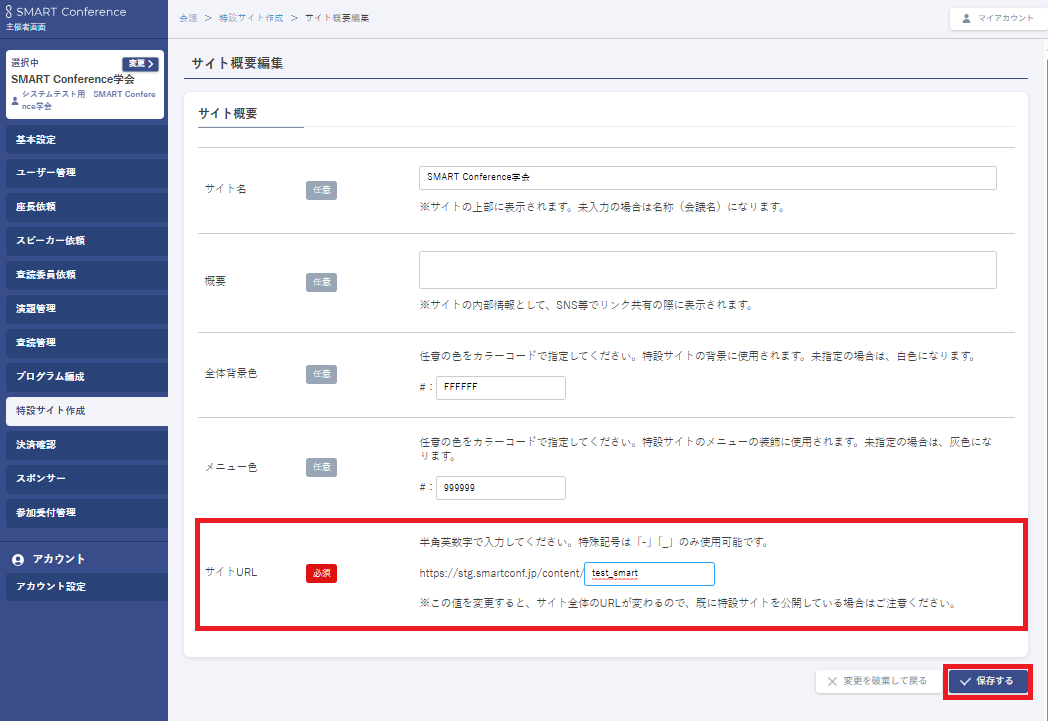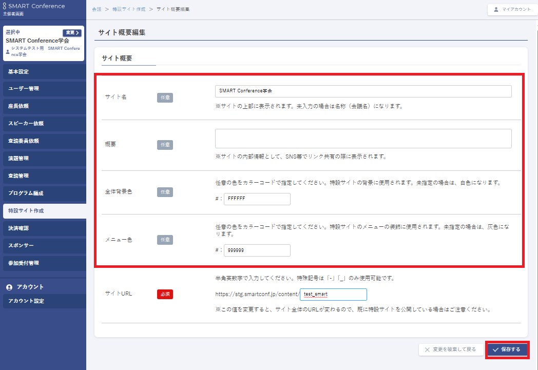 - サイト名:サイト上部に表示されます。未入力の場合は名称(会議名)になります。