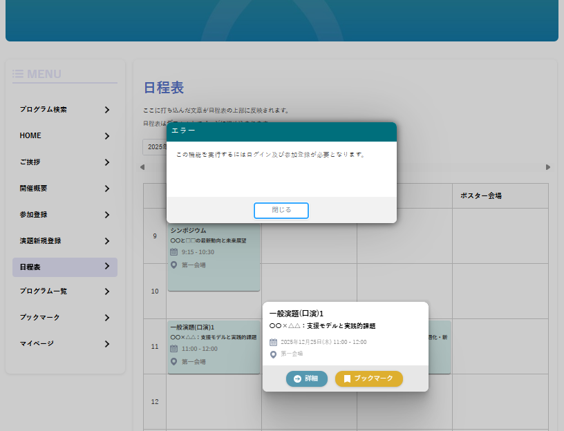 一度ポップアップを閉じて、詳細ボタンをクリックするとログイン画面が表示されます。 ログイン後の挙動は次の通りです。 詳細ボタンからログインした場合:参加登録済みの方は、セッション詳細ページが表示され、ブックマークが可能です。