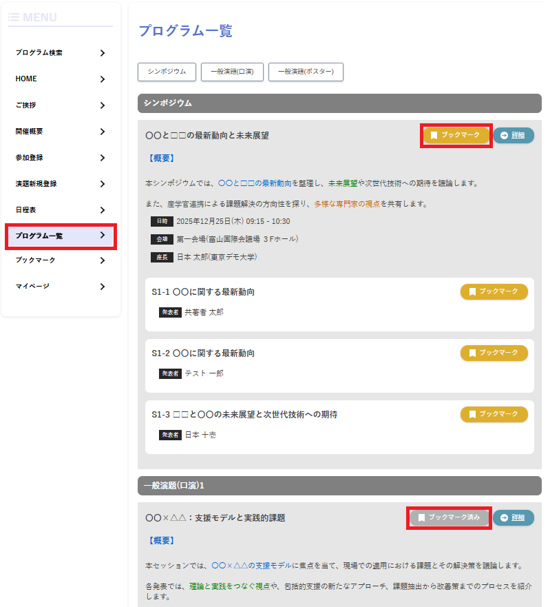 プログラム一覧ページでは演題ごとにブックマークが可能です。