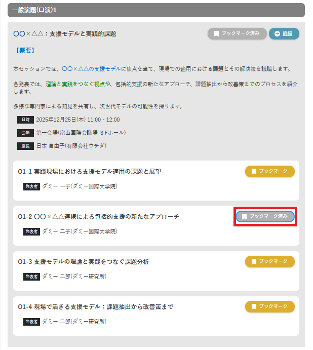 セッションをクリックすると、「詳細」「ブックマーク」ボタンが表示されます。「ブックマーク」をクリックすると、すぐにブックマークが完了します。