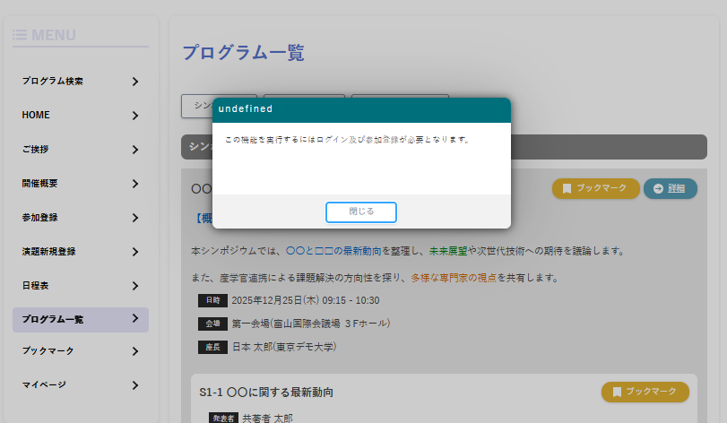 ログインしていない状態でプログラム一覧の「ブックマーク」ボタンをクリックすると、