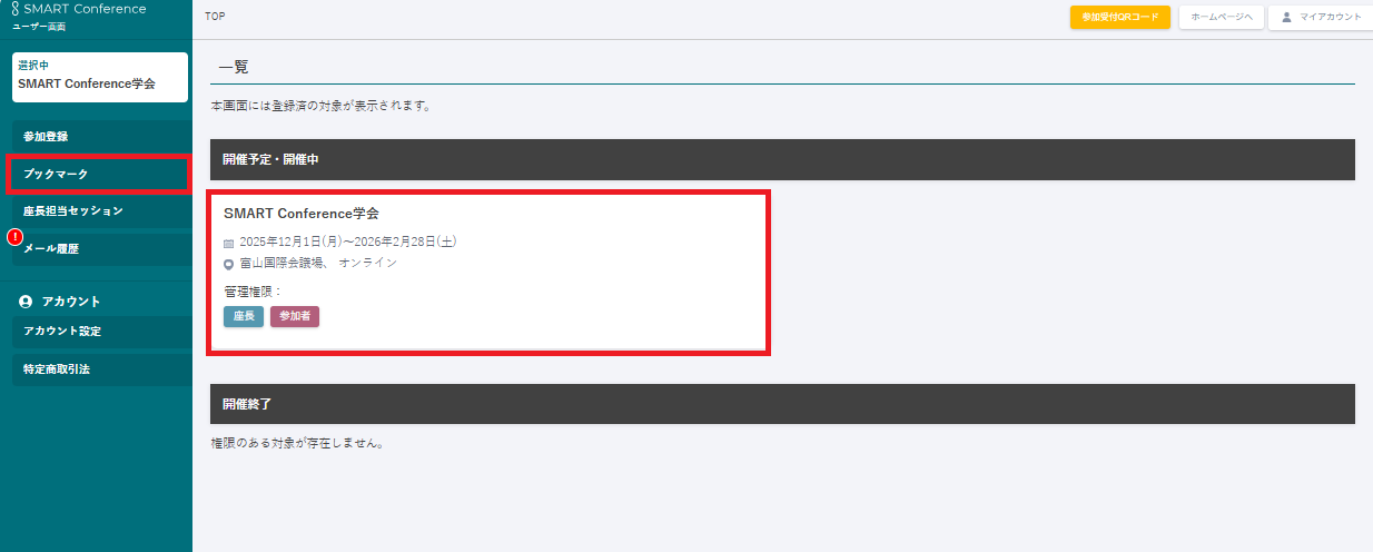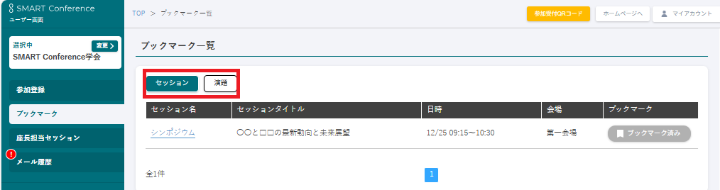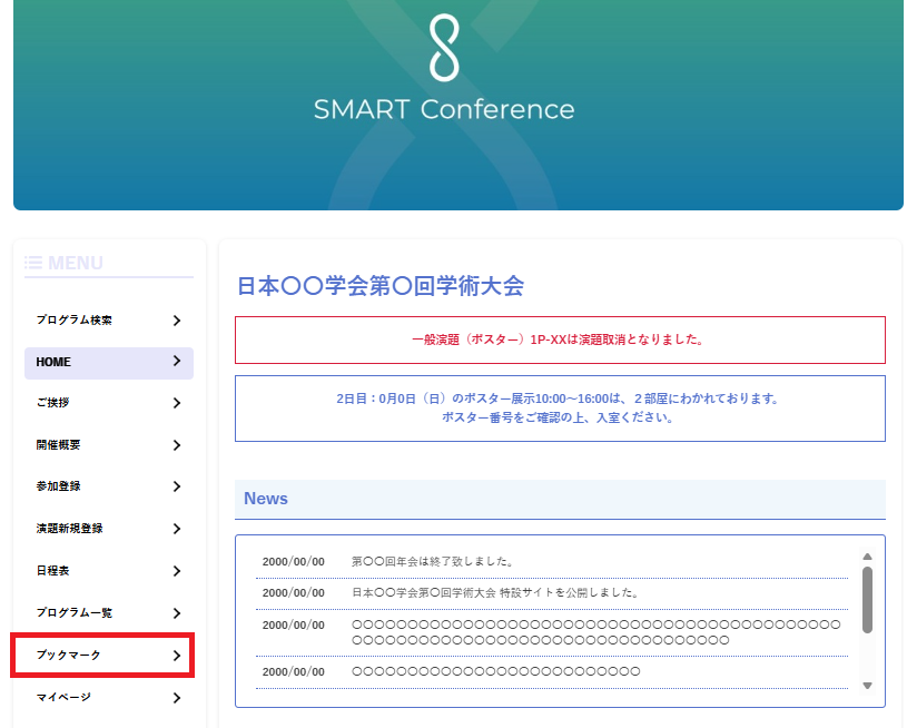 確認したいブックマークの学会をクリックし、サイドメニューの「ブックマーク」をクリックしてください。