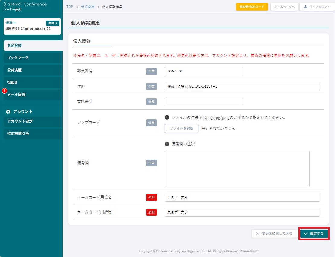5. 個人情報編集画面で修正内容を入力し、「✓確定する」をクリック