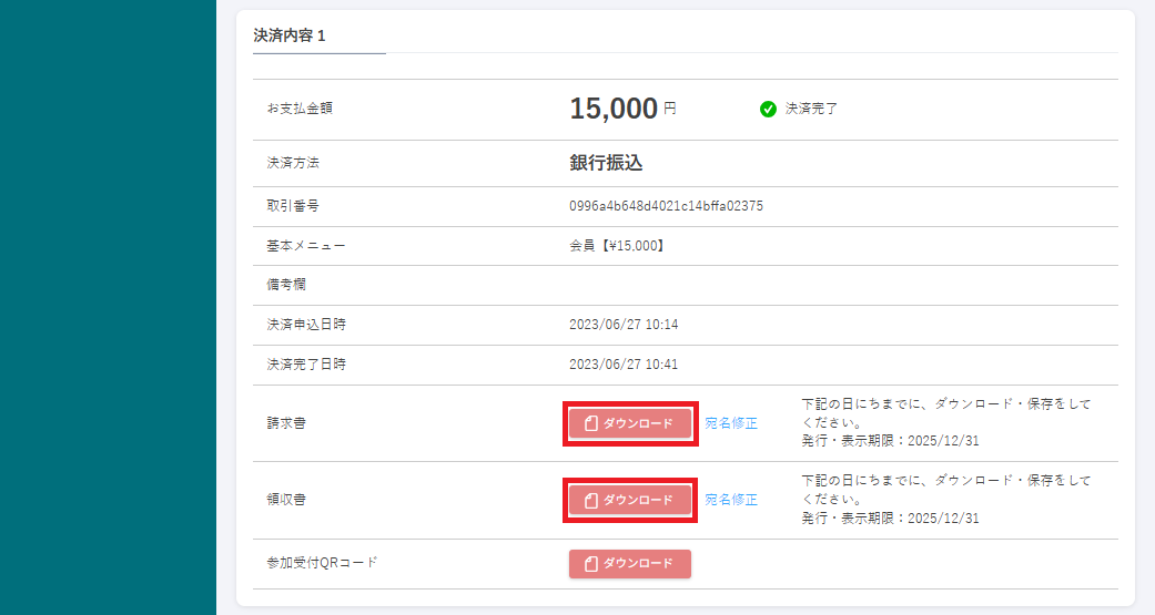 決済内容の請求書/領収書項目にある「ダウンロード」ボタンをクリックしてください。