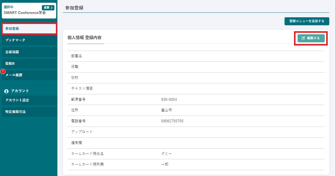 参加登録時に入力した個人情報が表示されますので、「編集する」ボタンをクリックしてください。