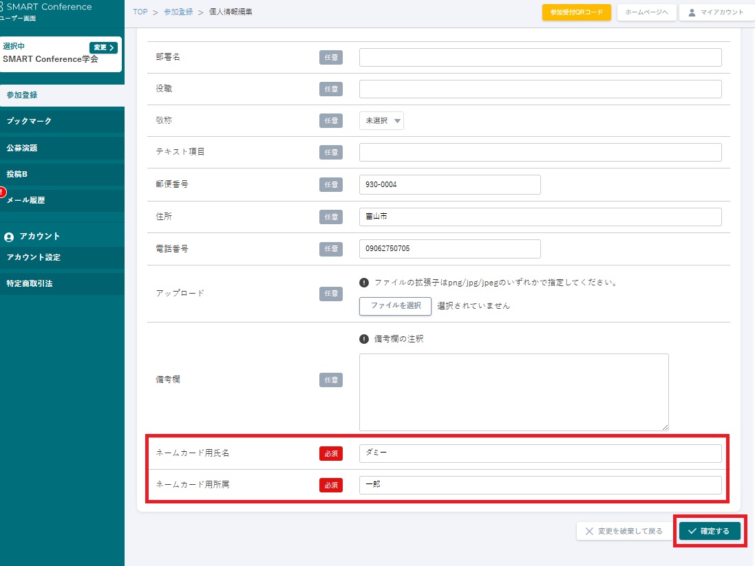 「ネームカード用 氏名」「所属」の項目を修正し、「✓確定する」ボタンをクリックすると変更が完了します。
