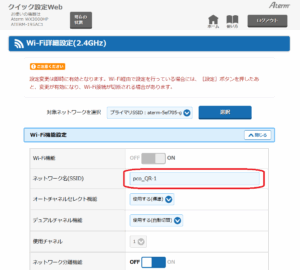 - WiFi機能設定を開き、ネットワーク名(SSID)の部分に、<PCO_QR-1>と入力