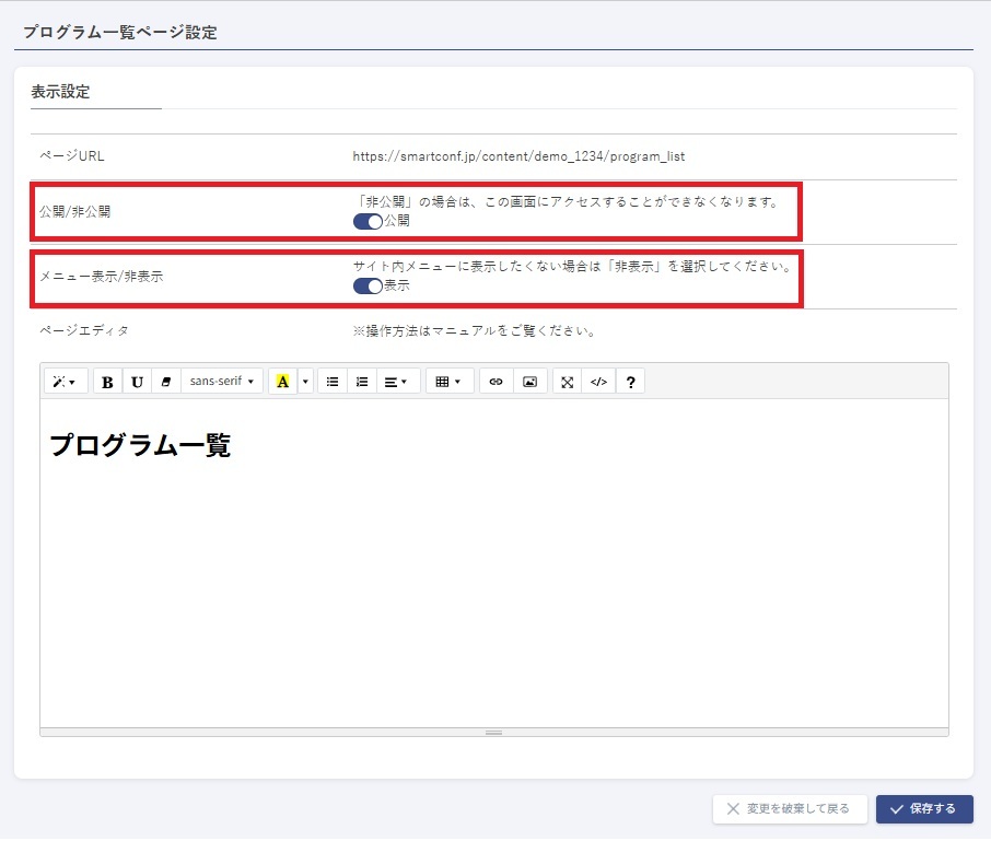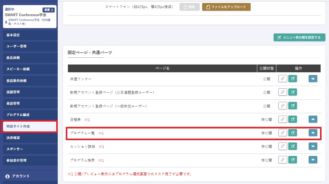 プログラム編成ですべてのタスクを完了後、特設サイト作成の項目から表示設定を行います。