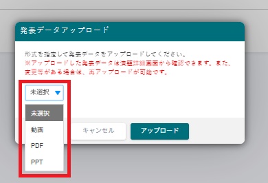 アップロードするデータの種類から、指定された形式(動画・PDF・PPT)を選択します。