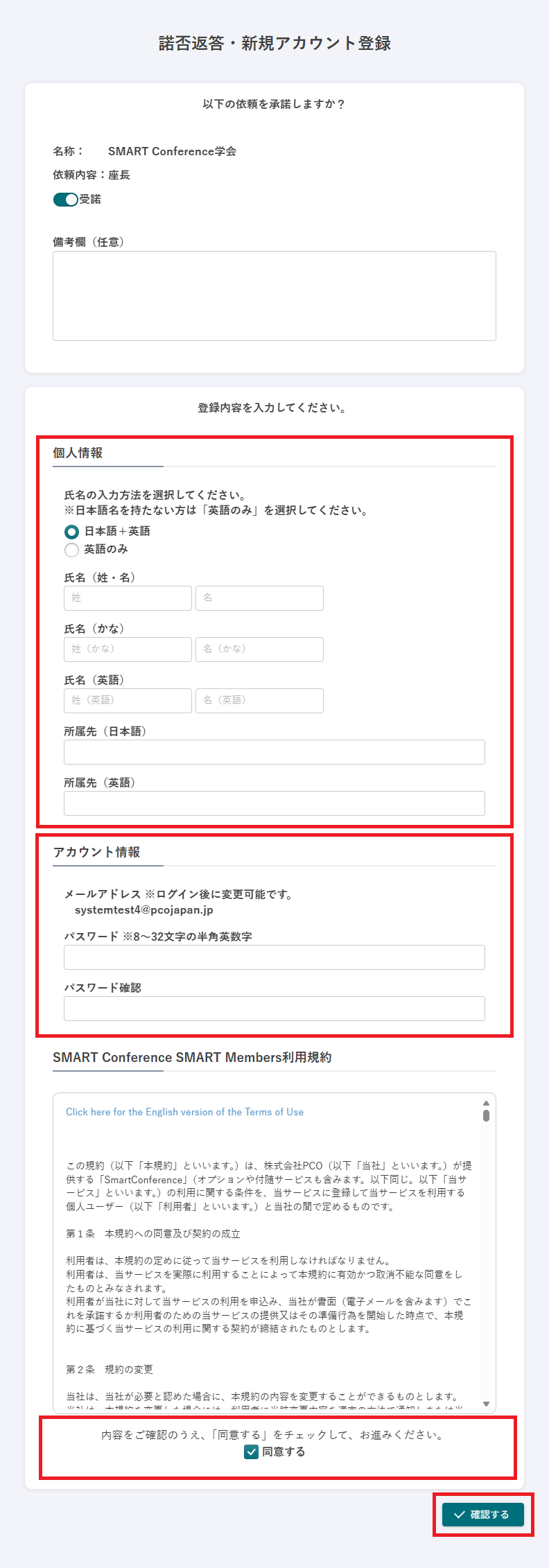 入力が完了しましたら、利用規約に同意して「✓確認する」をクリックしてください。