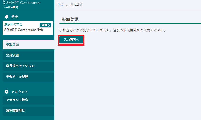 マイページの「参加登録」メニューで「入力画面へ」をクリックします。