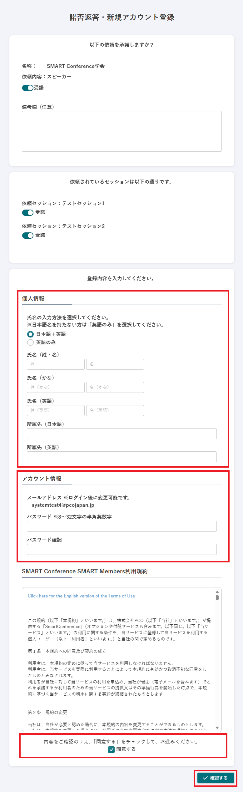 入力が完了しましたら、利用規約に同意して「✓確認する」をクリックしてください。