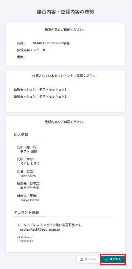確認画面で内容を確認後、「✓確定する」をクリックします。