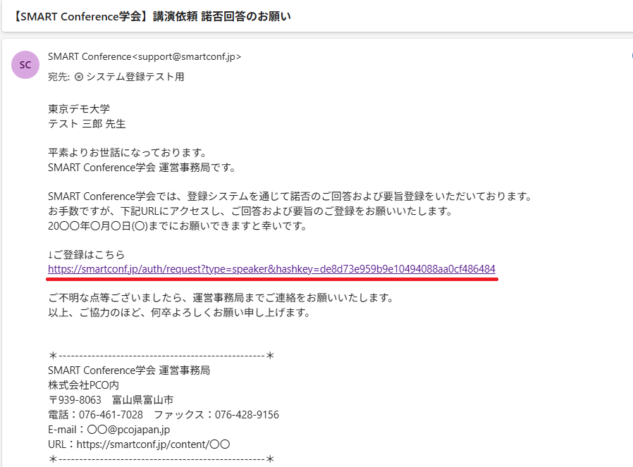 メール送信元は「support@smartconf.jp」もしくは学会独自のメールアドレスです。