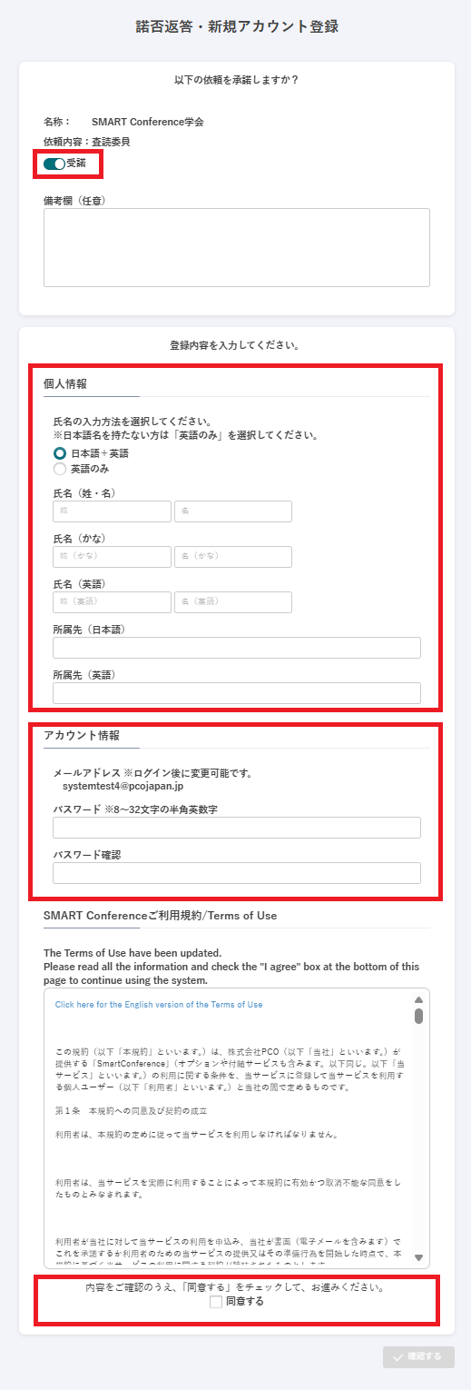 ・必要事項を入力し、利用規約に同意したら「✓確認する」をクリックしてください。