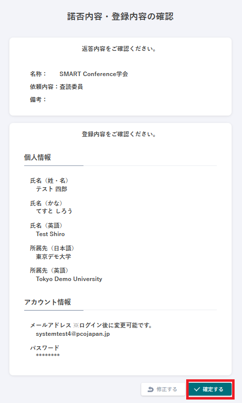 確認画面で内容を確認後、「✓確定する」をクリックします。