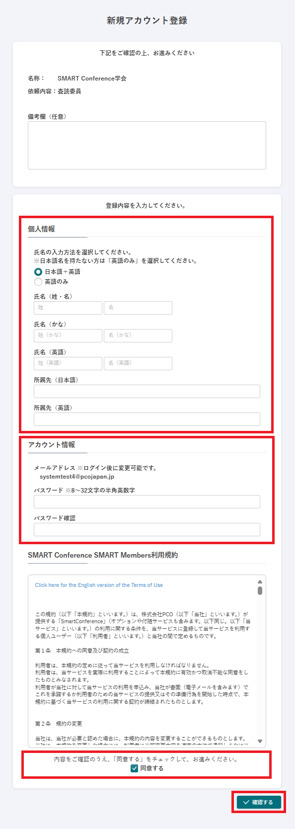 ・必要事項を入力し、利用規約に同意したら「✓確認する」をクリックしてください。