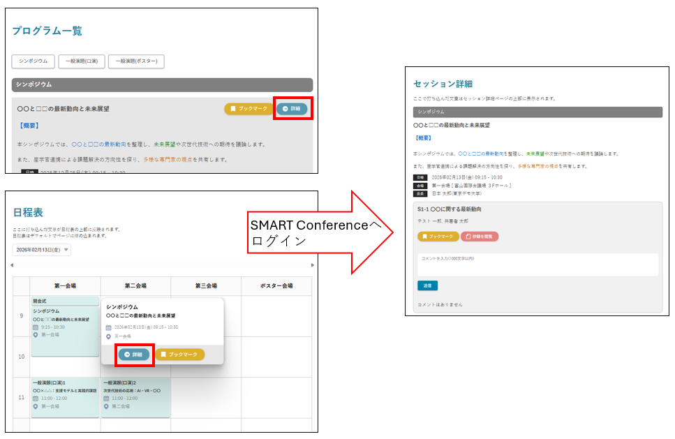 プログラム一覧や日程表から、各セッションの 「詳細」ボタン をクリックすると、セッション詳細画面が表示されます。