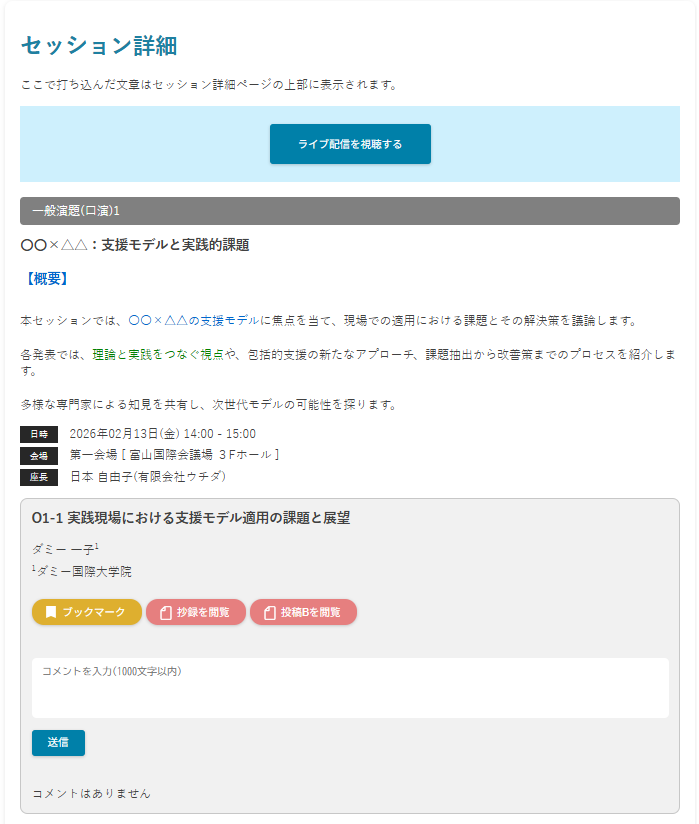 セッション詳細では、選択したセッションや発表について、プログラム一覧より詳しい情報の確認や、オンライン視聴などの操作を行うことができます。