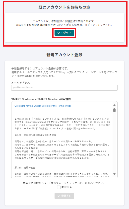 過去にSMART Conferenceを利用したことがある場合、同じメールアドレスで新規登録を行うとエラーが表示されます。