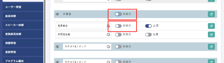 2. 共著者・発表者名の項目に非表示設定を追加
